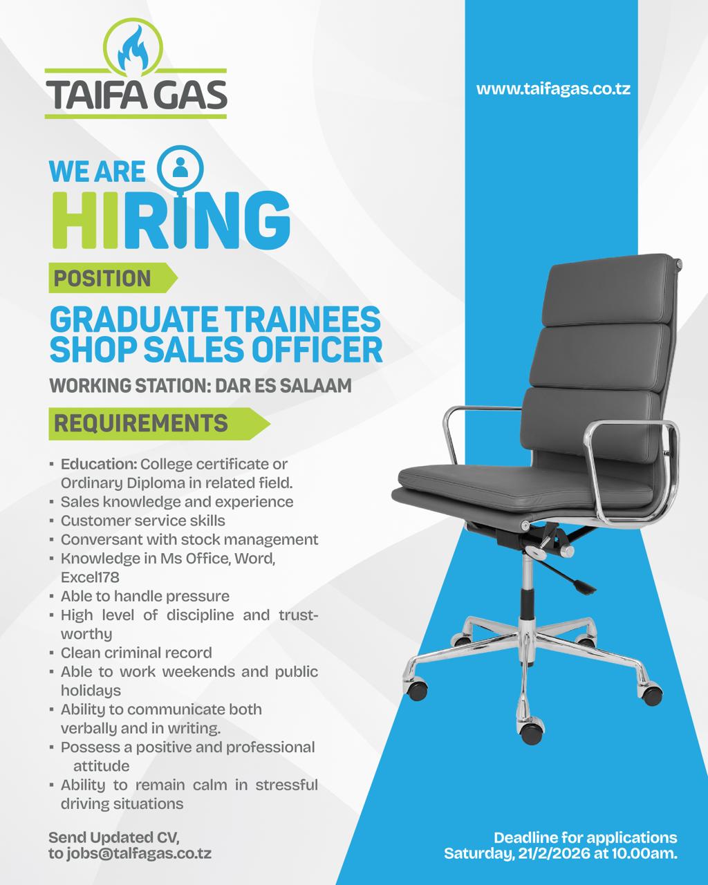 GRADUATE TRAINEES SHOP SALES OFFICER Job Category: GRADUATE TRAINEES SHOP SALES OFFICER Job Type: Full Time Job Location: DAR ES SALAAM Apply for this position Full Name *Email *Phone *Cover Letter *Upload CV/Resume *Allowed Type(s): .pdf, .doc, .docxBy using this form you agree with the storage and handling of your data by this website. *