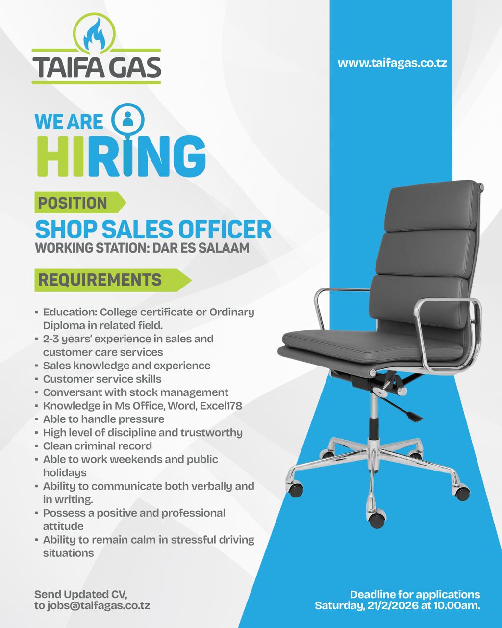 SHOP SALES OFFICER Job Category: SHOP SALES OFFICER Job Type: Full Time Job Location: DAR ES SALAAM Apply for this position Full Name *Email *Phone *Cover Letter *Upload CV/Resume *Allowed Type(s): .pdf, .doc, .docxBy using this form you agree with the storage and handling of your data by this website. *